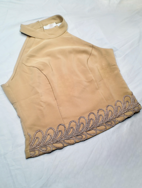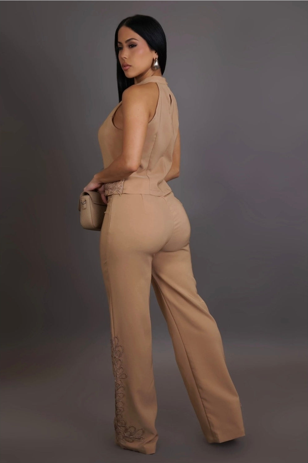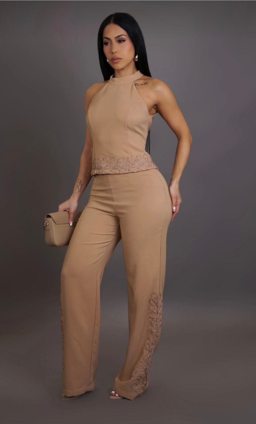 El Desert Muse Set redefine la elegancia minimalista con su tono nude cálido y bordado artesanal en los bordes. Su top halter realza el cuello y los hombros, mientras el pantalón de caída amplia crea una figura esbelta y poderosa. Es la pieza perfecta para mujeres que dominan con sutileza, seguras y sofisticadas, ideal para una cena, cóctel o evento especial.